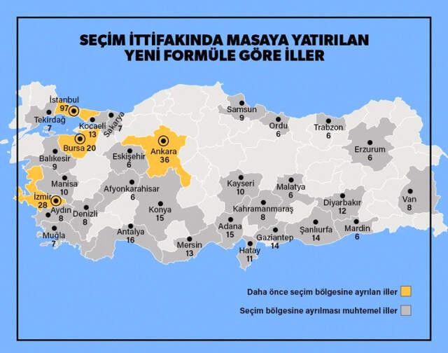 MHP Genel Başkanı Devlet Bahçeli ile Cumhurbaşkanı Recep Tayyip Erdoğan'ın 'seçim ittifakı' hakkında yaptığı görüşmenin ardından kurulan komisyonda toplantılar ve hazırlıklar tüm hızıyla devam ediyor. En son yapılan görüşmede masaya sürpriz bir model getirildi. Yeni dillendirilen bu model benimsenirse 2019 seçimlerinde 31 ilde seçim bölgeleri oluşturulacak ve yeni bir harita ortaya çıkmış olacak.MHP Genel Başkanı Devlet Bahçeli, "MHP, Adalet ve Kalkınma Partisi ile Cumhurbaşkanlığı Hükümet etme sistemini 2019'da tam manasıyla tesis etme maksadıyla sonuna kadar birlikte ve yan yana mücadelesini sürdürecektir" sözleriyle gündeme getirdiği seçim ittifakı çalışmalarında sıcak anlar yaşanıyor. Yeni Şafak'tan Emrah Yeşilduman'ın haberine göre Bahçeli'nin açıklamalarıyla başlayan seçim ittifakı görüşmelerinde AK Parti ve MHP arasında yeni bir formül masaya yatırıldı. Daha önce seçim barajının aynen korunmasının yanında daraltılmış bölge üzerinde çalışma yapılması planlanıyordu. Ancak son görüşmede yeni bir formül dile getirildi. Buna göre; 6 ya da 8'den fazla vekil çıkaran iller birden fazla seçim bölgesine bölünecek. Bu şekilde hangi parti o bölgede etkinse onun adayı öne çıkartılacak. 6 vekil üzerinden bu sistem uygulanırsa Türkiye'de 31 il, birden fazla seçim bölgesine bölünecek.