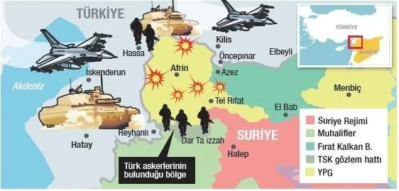 11.33: Türk Silahlı Kuvvetlerince, Suriye'nin Afrin bölgesinde PKK/KCK/PYD-YPG ve DEAŞ'a mensup teröristleri etkisiz hale getirmek üzere başlattığı "Zeytin Dalı Harekatı"nın 3. gününde Hatay'ın Hassa ilçesi Yarım Aktepe mevkisinde sınırın sıfır noktasında bulunan Sakız Karakolundan bazı tankların atış yaptığı duyuldu. Öte yandan, Yarım Aktepe mevkiinde ise Türk askerleri ve Özgür Suriye Ordusu'na bağlı askerler olası bir takviye için hazır bekletiliyor.