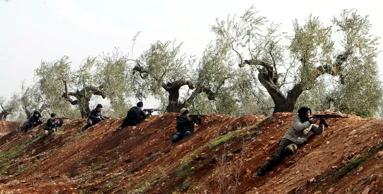 (Türkiye tarafından eğitilen 7 bin ÖSO savaşçısı, teröristlerin araya sızmasını önlemek için kollarına sarı bant taktı)